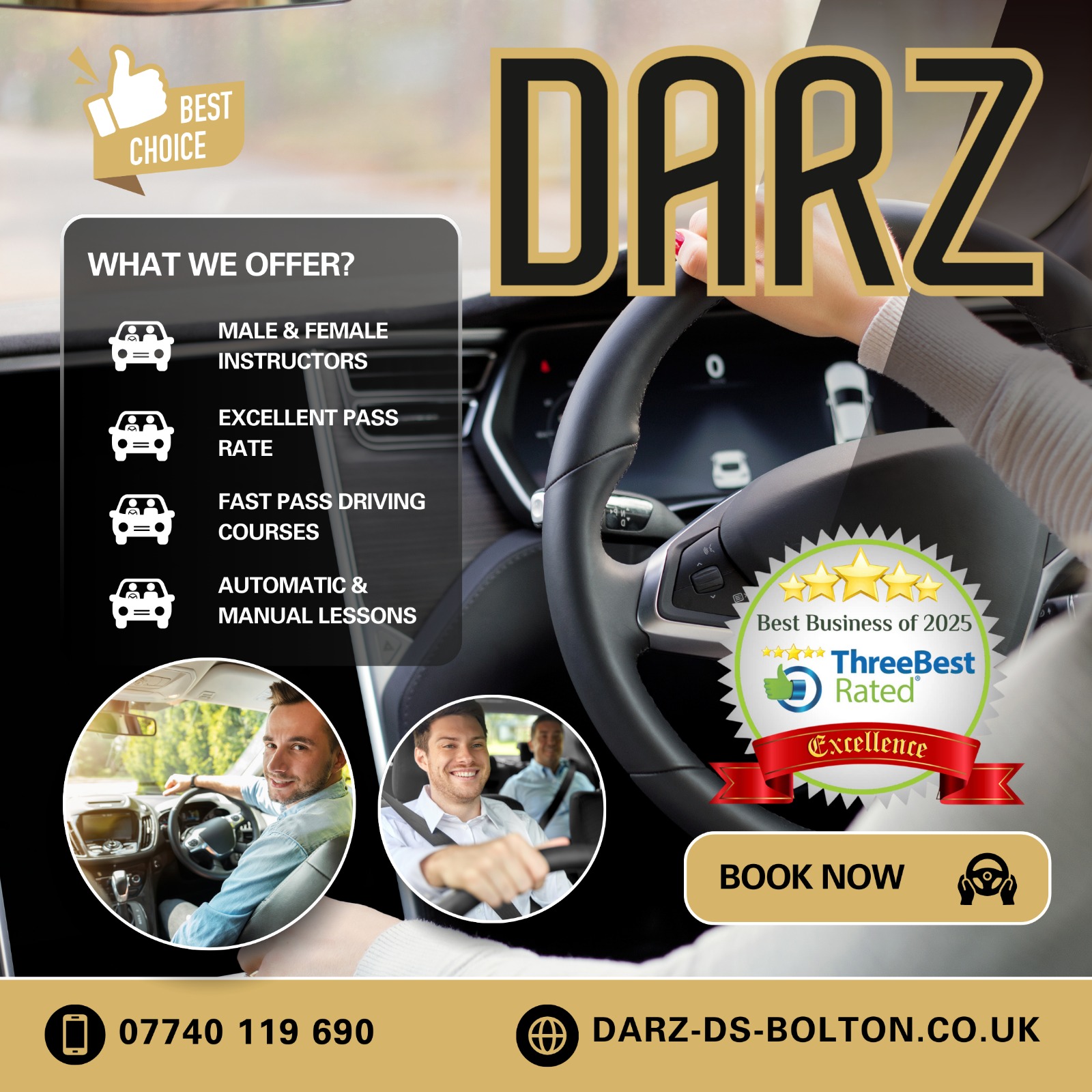 With a strong reputation in the local community and experienced DVSA-approved instructors, Darz Driving School provides structured, tailored training using modern teaching methods to help students become safe, skilled drivers. Whether you’re a complete beginner or brushing up for your test, Darz offers lessons to suit your needs. Darz Driving School Bolton